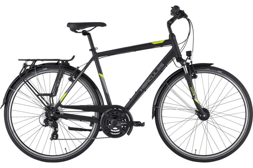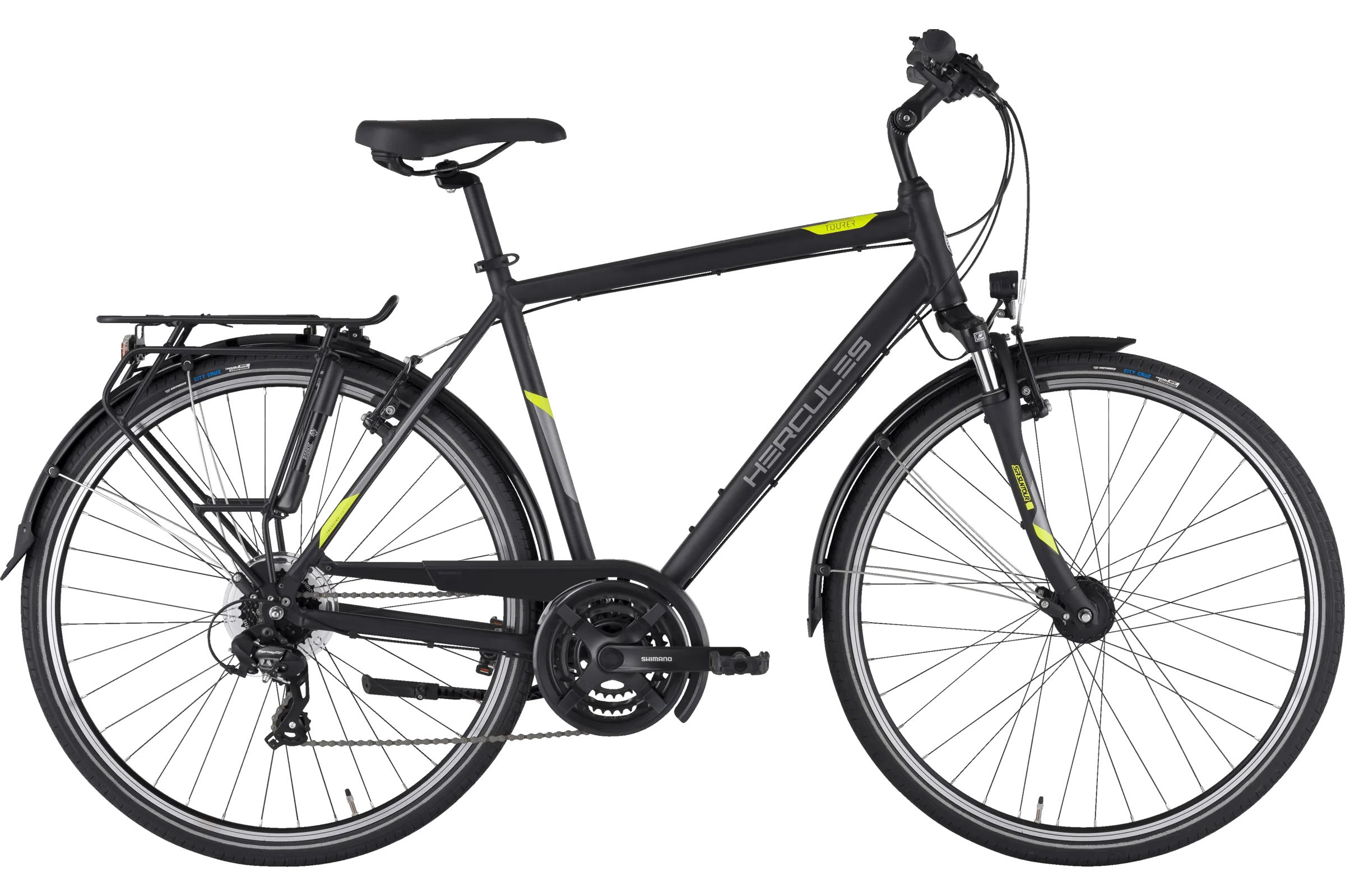 Voir tous les magasins qui vendent HerculesLe HERCULES Tourer 21 est un vélo pour toutes les occasions. En tant que vélo de trekking classique, il est à l'aise aussi bien sur les routes que dans le trafic urbain, ainsi que sur les circuits sportifs. Son équipement polyvalent, aussi sportif avec son dérailleur 21 vitesses et sa fourche suspendue que pratique au quotidien avec son éclairage LED, son porte-bagages et ses garde-boue, s'y prête parfaitement. Les freins mécaniques sur jante sont fiables et faciles à entretenir. Trois formes de cadre avec jusqu'à quatre tailles rendent le Tourer intéressant pour de nombreux cyclistes.