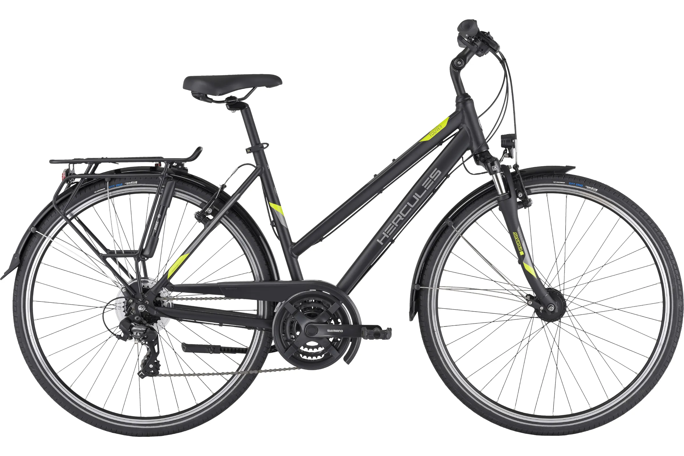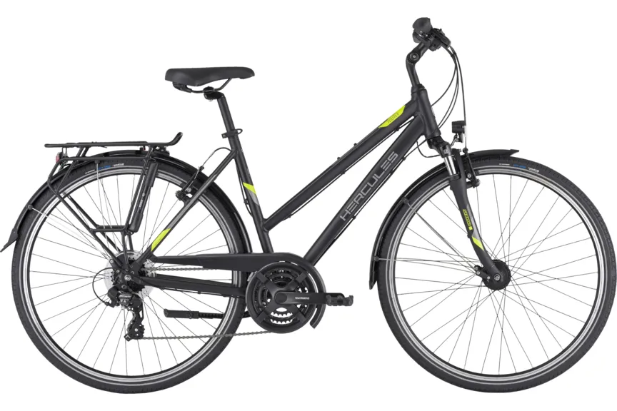 Voir tous les magasins qui vendent HerculesLe HERCULES Tourer 21 est un vélo pour toutes les occasions. En tant que vélo de trekking classique, il est à l'aise aussi bien sur les routes que dans le trafic urbain, ainsi que sur les circuits sportifs. Son équipement polyvalent, aussi sportif avec son dérailleur 21 vitesses et sa fourche suspendue que pratique au quotidien avec son éclairage LED, son porte-bagages et ses garde-boue, s'y prête parfaitement. Les freins mécaniques sur jante sont fiables et faciles à entretenir. Trois formes de cadre avec jusqu'à quatre tailles rendent le Tourer intéressant pour de nombreux cyclistes.