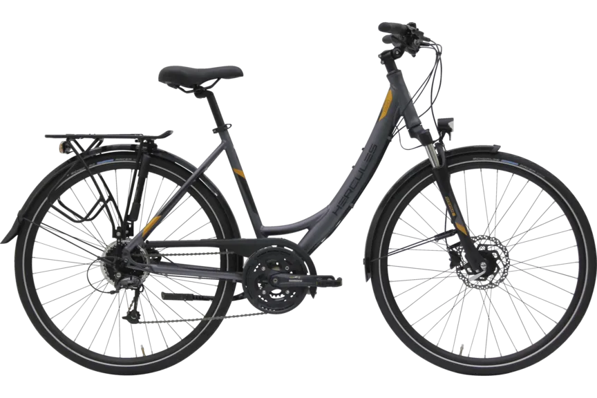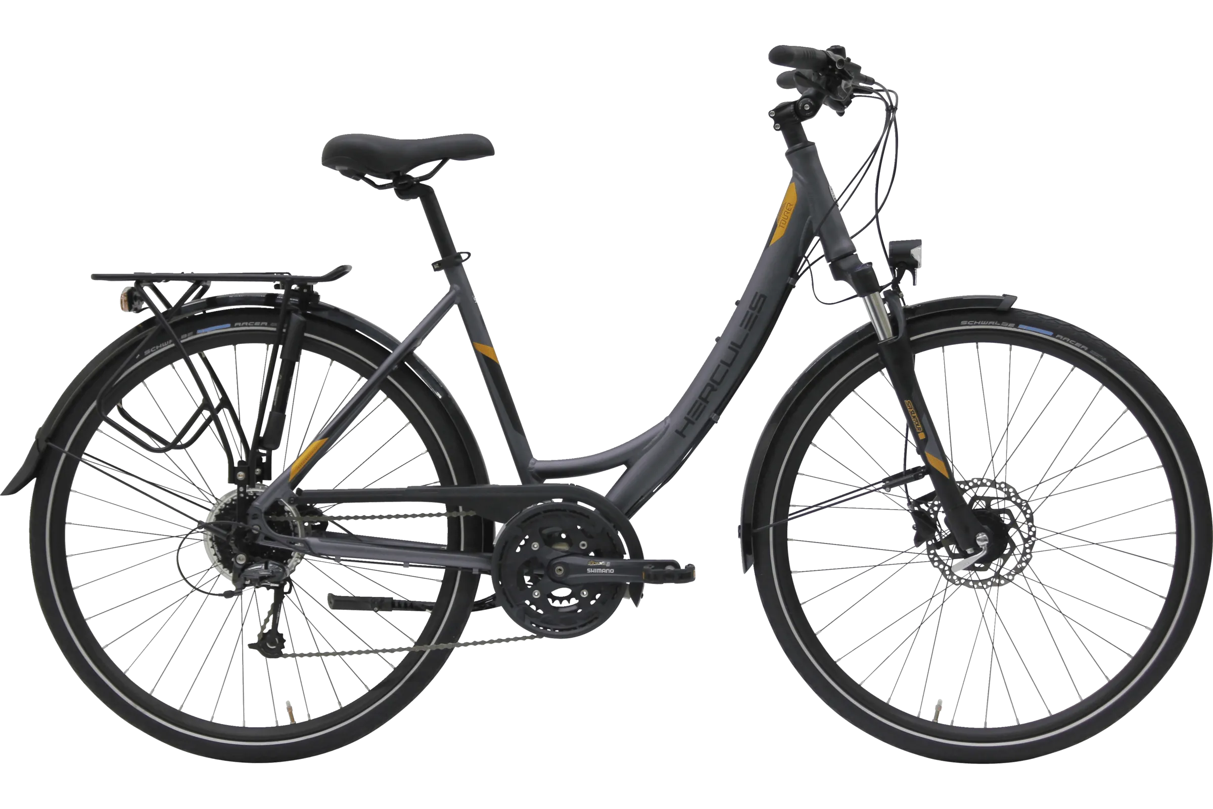 Voir tous les magasins qui vendent HerculesEn tant que vélo de trekking classique avec un équipement de qualité, le Tourer Comp fait battre plus fort le cœur des grands cyclistes. Avec un dérailleur à 27 vitesses, des freins à disque et une fourche suspendue, ce vélo polyvalent est équipé de manière sportive. Un porte-bagages solide et le légendaire Schwalbe Marathon avec protection anti-crevaison GreenGuard apportent une touche de voyage. Ceux qui souhaitent utiliser le Tourer au quotidien se réjouiront du système d'éclairage LED et de la position d'assise agréable. Enfin, le Trekkingbike est disponible en trois formes de cadre et en de nombreuses tailles, ce qui permet de répondre aux préférences des cyclistes les plus divers.