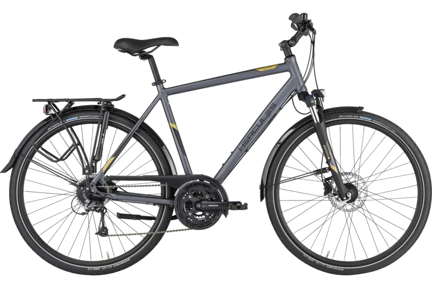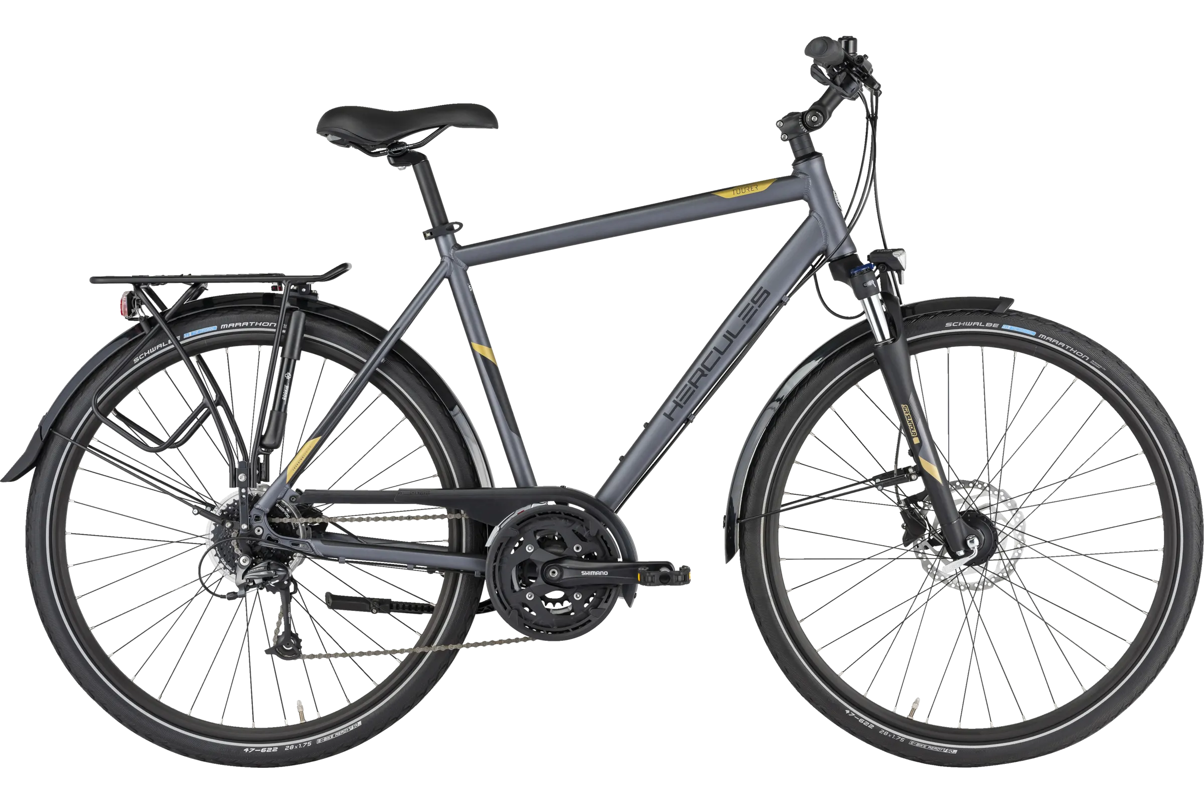 Voir tous les magasins qui vendent HerculesEn tant que vélo de trekking classique avec un équipement de qualité, le Tourer Comp fait battre plus fort le cœur des grands cyclistes. Avec un dérailleur à 27 vitesses, des freins à disque et une fourche suspendue, ce vélo polyvalent est équipé de manière sportive. Un porte-bagages solide et le légendaire Schwalbe Marathon avec protection anti-crevaison GreenGuard apportent une touche de voyage. Ceux qui souhaitent utiliser le Tourer au quotidien se réjouiront du système d'éclairage LED et de la position d'assise agréable. Enfin, le Trekkingbike est disponible en trois formes de cadre et en de nombreuses tailles, ce qui permet de répondre aux préférences des cyclistes les plus divers.