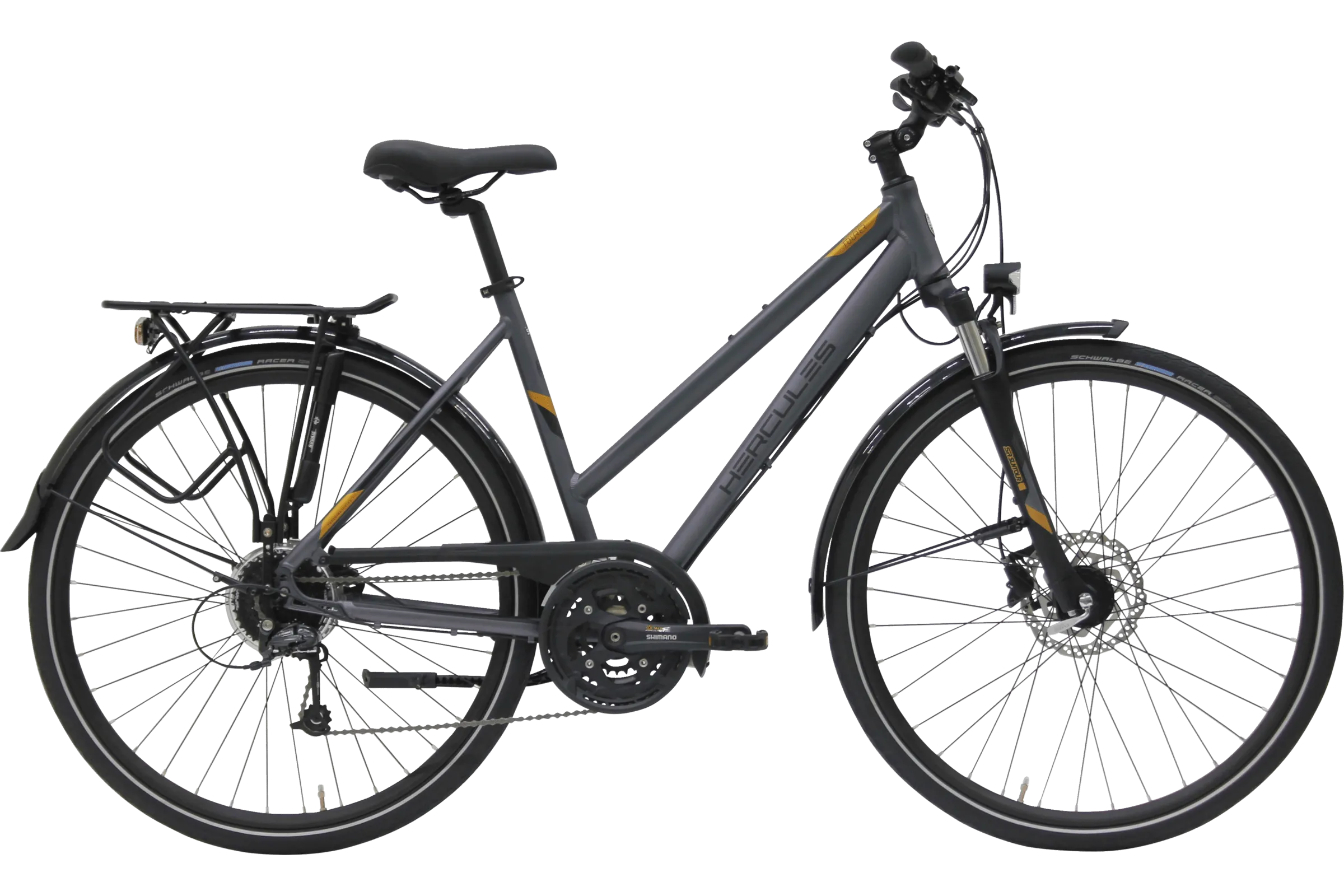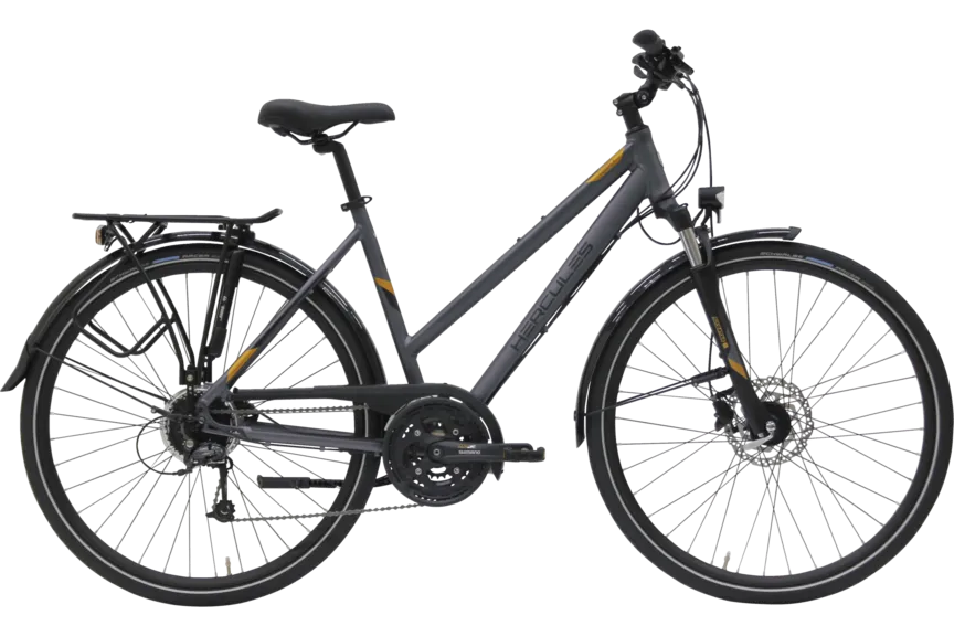 Voir tous les magasins qui vendent HerculesEn tant que vélo de trekking classique avec un équipement de qualité, le Tourer Comp fait battre plus fort le cœur des grands cyclistes. Avec un dérailleur à 27 vitesses, des freins à disque et une fourche suspendue, ce vélo polyvalent est équipé de manière sportive. Un porte-bagages solide et le légendaire Schwalbe Marathon avec protection anti-crevaison GreenGuard apportent une touche de voyage. Ceux qui souhaitent utiliser le Tourer au quotidien se réjouiront du système d'éclairage LED et de la position d'assise agréable. Enfin, le Trekkingbike est disponible en trois formes de cadre et en de nombreuses tailles, ce qui permet de répondre aux préférences des cyclistes les plus divers.