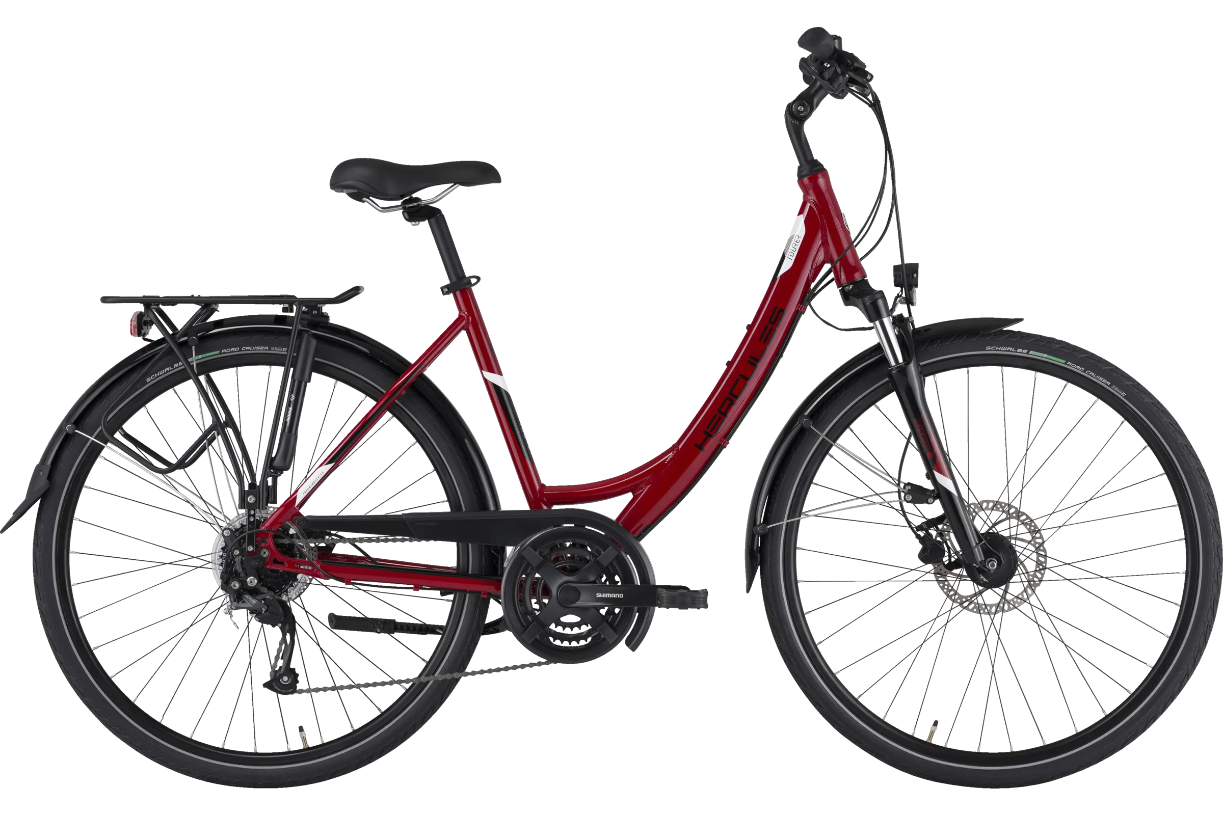 Voir tous les magasins qui vendent HerculesLe HERCULES Tourer Sport est un bon choix pour les randonnées avec bagages, les trajets quotidiens ou les tours d'assiette du soir. À un prix attractif, il réunit toutes les caractéristiques d'un vélo de trekking solide : un dérailleur 3x8 vitesses est à bord, tout comme des freins à disque hydrauliques. Le système d'éclairage à LED garantit une utilisation quotidienne, tandis que le porte-bagages est également adapté aux randonnées de plusieurs jours. Une fourche suspendue est également de la partie, tandis que la position d'assise est plutôt adaptée à un kilométrage confortable. Le Tourer est aussi polyvalent que son domaine d'utilisation, avec trois formes de cadre et trois ou quatre tailles.