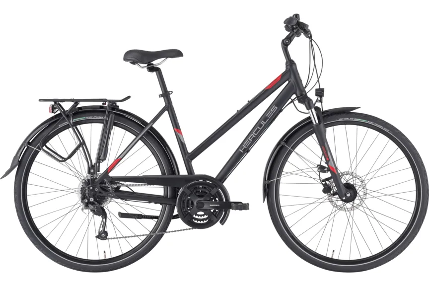 Voir tous les magasins qui vendent HerculesLe HERCULES Tourer Sport est un bon choix pour les randonnées avec bagages, les trajets quotidiens ou les tours d'assiette du soir. À un prix attractif, il réunit toutes les caractéristiques d'un vélo de trekking solide : un dérailleur 3x8 vitesses est à bord, tout comme des freins à disque hydrauliques. Le système d'éclairage à LED garantit une utilisation quotidienne, tandis que le porte-bagages est également adapté aux randonnées de plusieurs jours. Une fourche suspendue est également de la partie, tandis que la position d'assise est plutôt adaptée à un kilométrage confortable. Le Tourer est aussi polyvalent que son domaine d'utilisation, avec trois formes de cadre et trois ou quatre tailles.